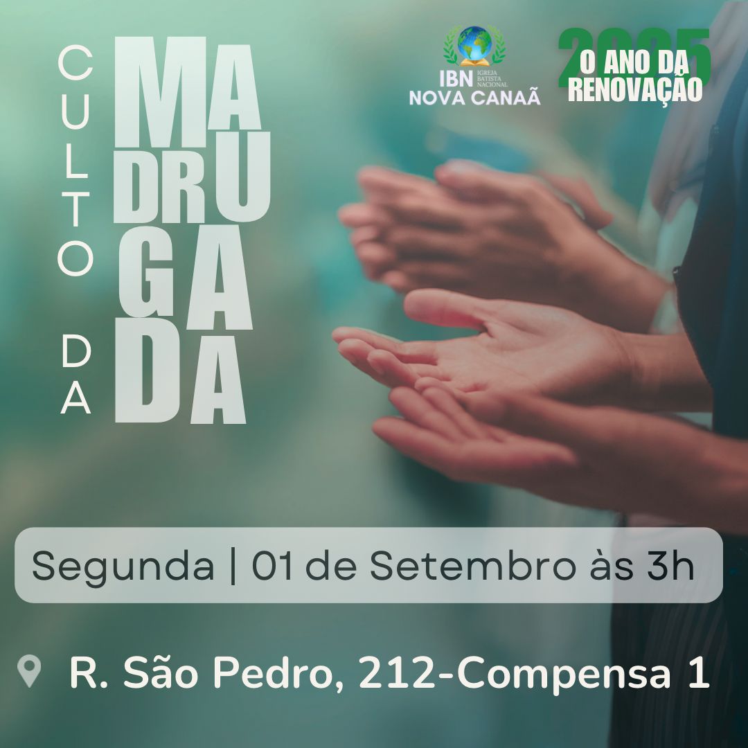 Igreja Batista Nacional Nova Canaã Rua São Pedro, 212, Compensa 1, ManausDespertando Servos para o Serviço._2 Timóteo 1:6_ NOSSA MISSÃO É NOBRE E URGENTE.O TEMPO É AGORA! O Senhor está chamando líderes dispostos, corações disponíveis e servos comprometidos com o Reino! Este é um tempo de renovação, preparo e despertamento espiritual. Não adie o que Deus quer fazer através de você. Ler mais…