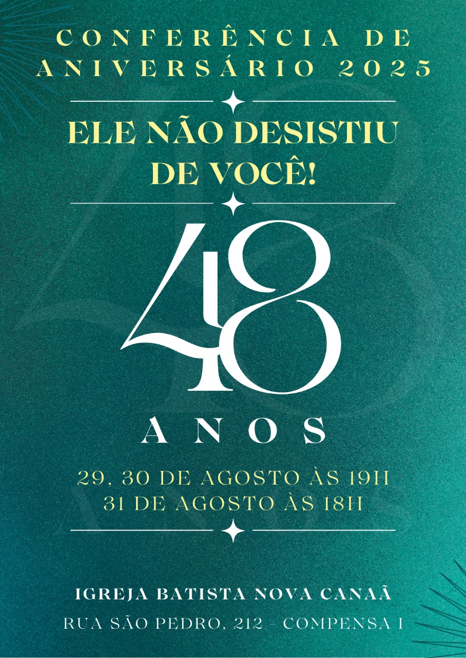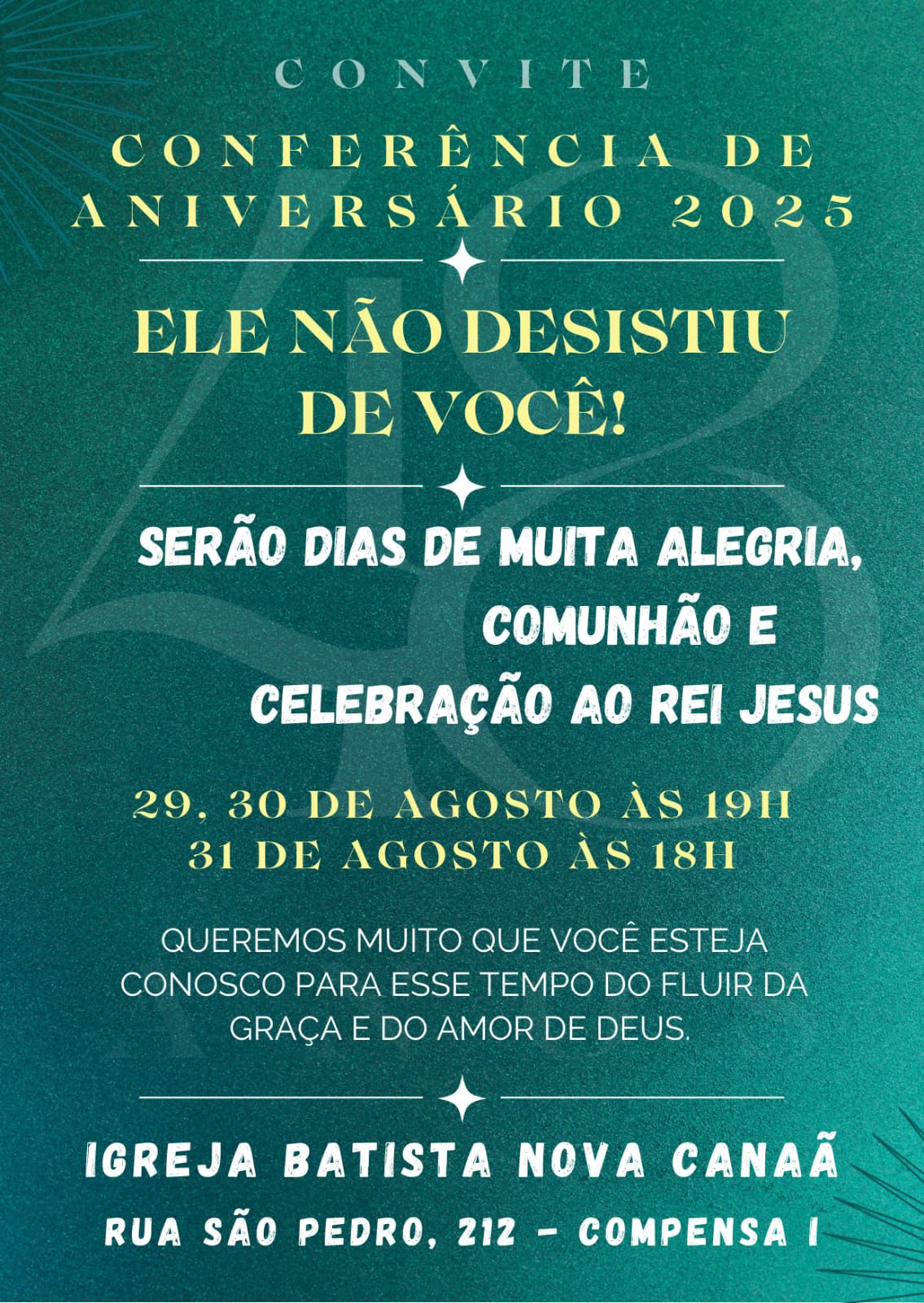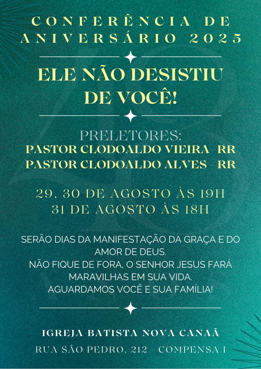 Igreja Batista Nacional Nova Canaã Rua São Pedro, 212, Compensa 1, Manaus, Amazonas, BrasilDespertando Servos para o Serviço._2 Timóteo 1:6_ NOSSA MISSÃO É NOBRE E URGENTE.O TEMPO É AGORA! O Senhor está chamando líderes dispostos, corações disponíveis e servos comprometidos com o Reino! Este é um tempo de renovação, preparo e despertamento espiritual. Não adie o que Deus quer fazer através de você. Ler mais…